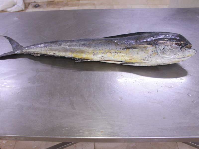 The mahi-mahi (/'m??hi?'m??hi?/) or common dolphinfish(Coryphaena hippurus) is a surface-dwelling ray-finned fish found in off-shore temperate, tropical and subtropical waters worldwide. Also widely called dorado and dolphin, it is one of two members of the Coryphaenidae family, the other being the pompano dolphinfish.